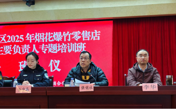 在开班仪式上,黔江区供销合作社分管负责人吴涛同志就烟花爆竹专营监管工作作了强调和要求。一是烟花爆竹行业专营监管的重要性。加强烟爆行业专营监管,有利于提升烟花爆竹从业人员依法经营和安全主体责任意识、规范烟花爆竹经营行为、净化烟花爆竹经营市场。二是专营监管的内容。分别从专营监管的对象、任务和具体内容三个方面,就区供销合作社对烟花爆竹行业的专营监管作了具体要求。三是总结2025年黔江区烟花爆竹行业专营监管工作,分析监管工作中存在的主要问题,提出2026年工作措施。区应急管理局、区公安局就烟花爆竹安全工作作出相应要求。