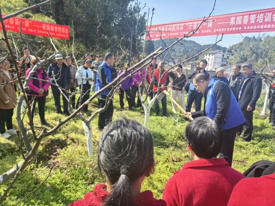 活动邀请西南大学席万鹏教授、周坤教授等专家现场培训、指导果园春管技术,并深入果园现场演示梨树的春季修剪、水肥管理等技术,耐心为种植户解答种植过程中疑问,让大家受益良多。活动现场还开展了农膜、农资、无人机宣传推广活动,区供销社现场宣讲了废弃农膜回收政策、推广加厚和全生物降解地膜的重要意义,引导种植户践行绿色生产方式;为支持本次活动,区供销社农资储备配送中心主动让利,专门制定了农资订购优惠方案,为当前春耕生产提供质优价廉的农资商品;还特别邀请了芯链中飞重庆科技有限公司现场展示了无人机植保飞防、载重转运等实用技术,为种植户们送上了丰盛的“春耕大礼包”。