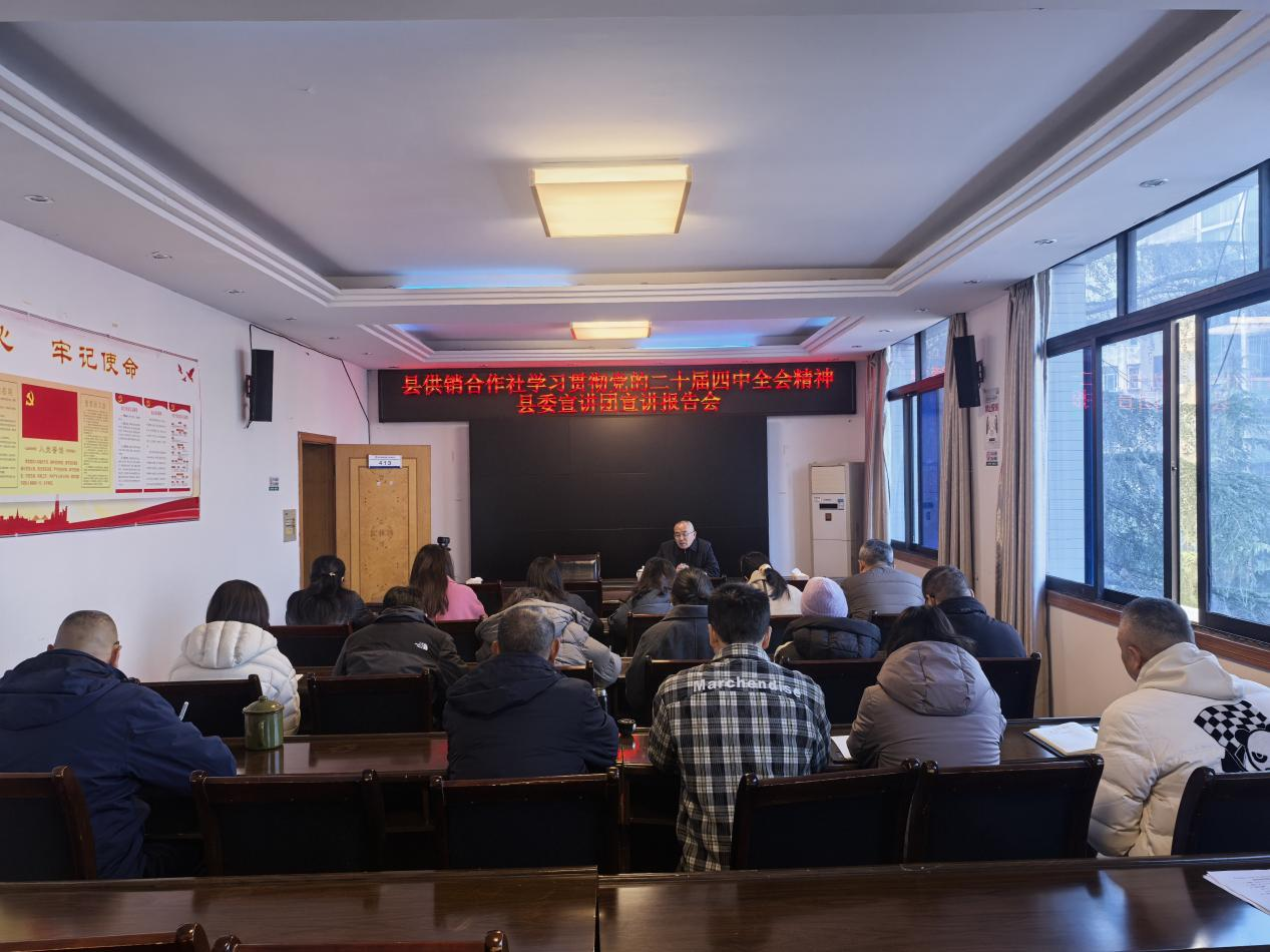 为学习贯彻好党的二十届四中全会精神,1月13日,县供销合作社邀请了县委宣讲团成员陈先刚同志到我单位宣讲党的二十届四中全会精神,我单位19名同志参会。