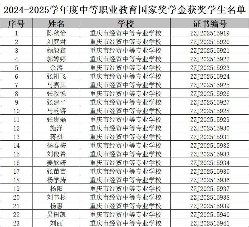 重庆市经贸中等专业学校23名优秀学子喜获2024—2025学年中职国家奖学金